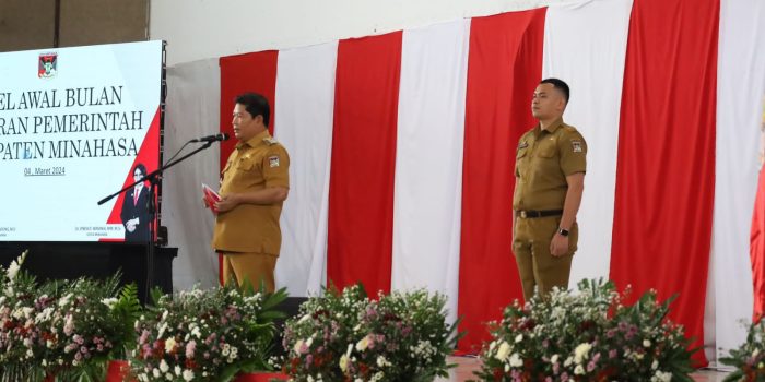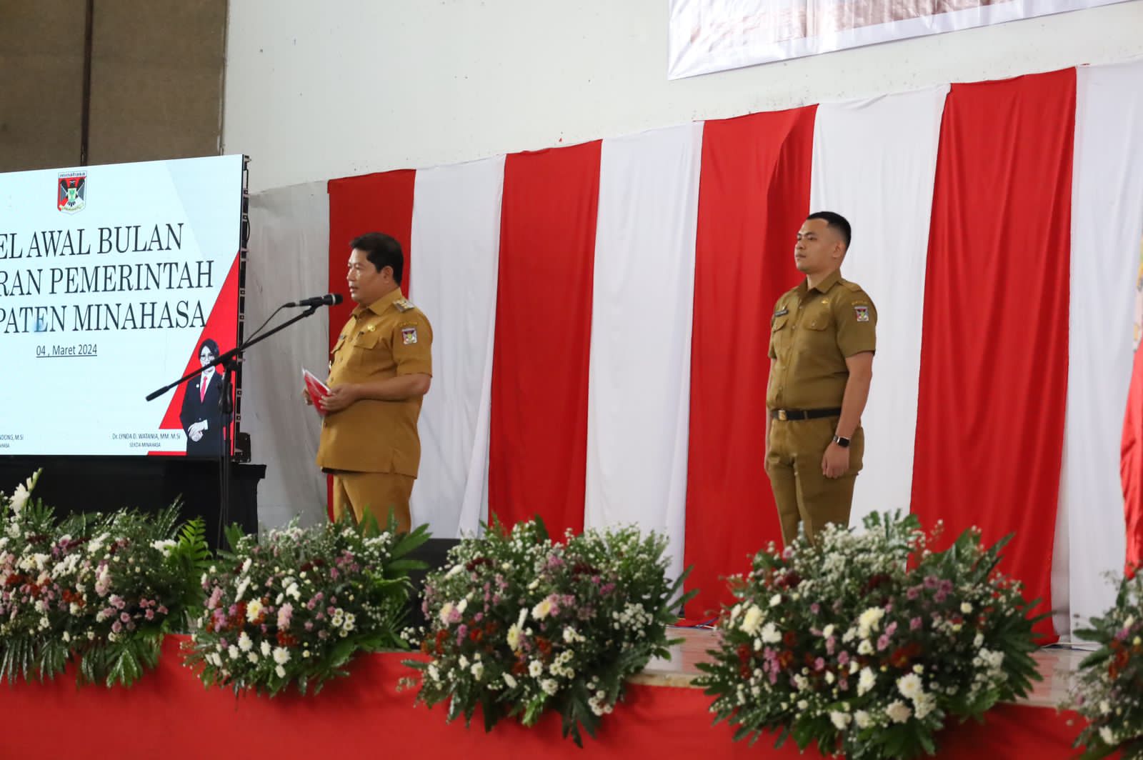 Tondano,Suluthebat Id – Penjabat Bupati Dr Jemmy Stani Kumendong MSi,di dampingi Sekda Lynda Watania, memimpin apel kerja awal Bulan Maret, di Gedung Wale Ne Tou Tondano, Senin 4/03/2024