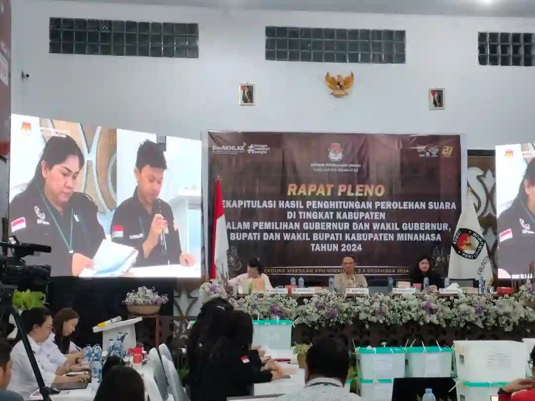 Tondano,suluthebat id – Rapat Pleno lanjutan penghitungan suara, Komisi Pemilihan Umum (KPU) Minahasa menyelesaikan rekapitulasi penghitungan suara di 25 Kecamatan yang berlangsung di Gedung KPU, Selasa (3/12/2024