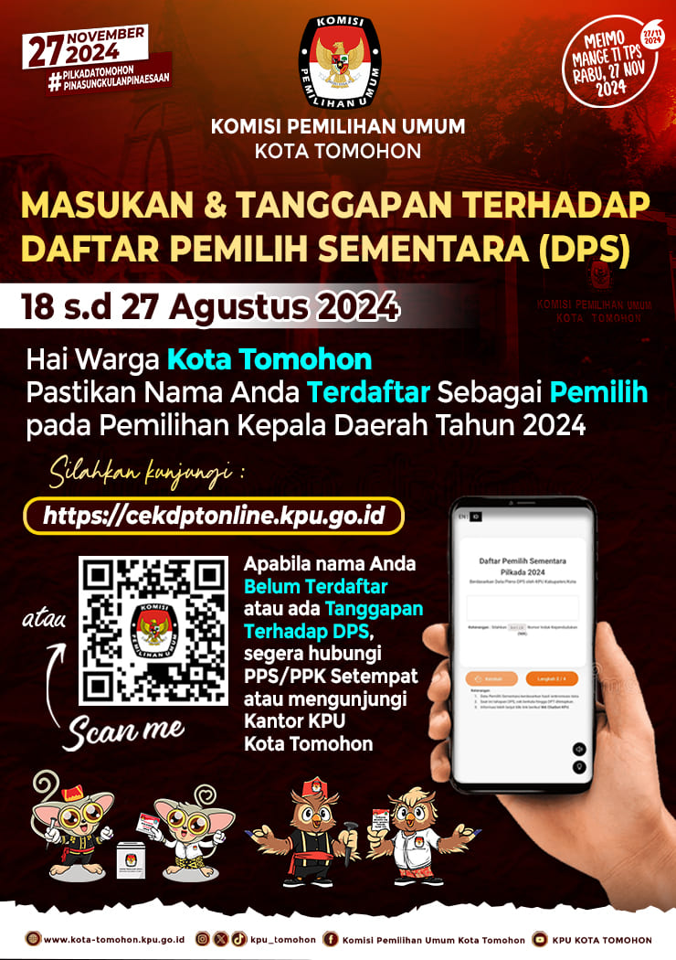 “Tahapan untuk tanggapan masyarakat terhadap DPS berlaku mulai 18 sampai 27 Agustus 2024. Jika belum tercatat, bisa melaporkan ke PPS (Panitia Pemungutan Suara, red) dan PPK (Panitia Pemilihan Kecamatan, red) setempat atau datang langsung ke kantor KPU Kota Tomohon. Langkah selanjutnya, kami akan menyusun DPS hasil perbaikan,” jelasnya.