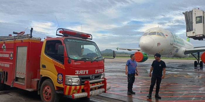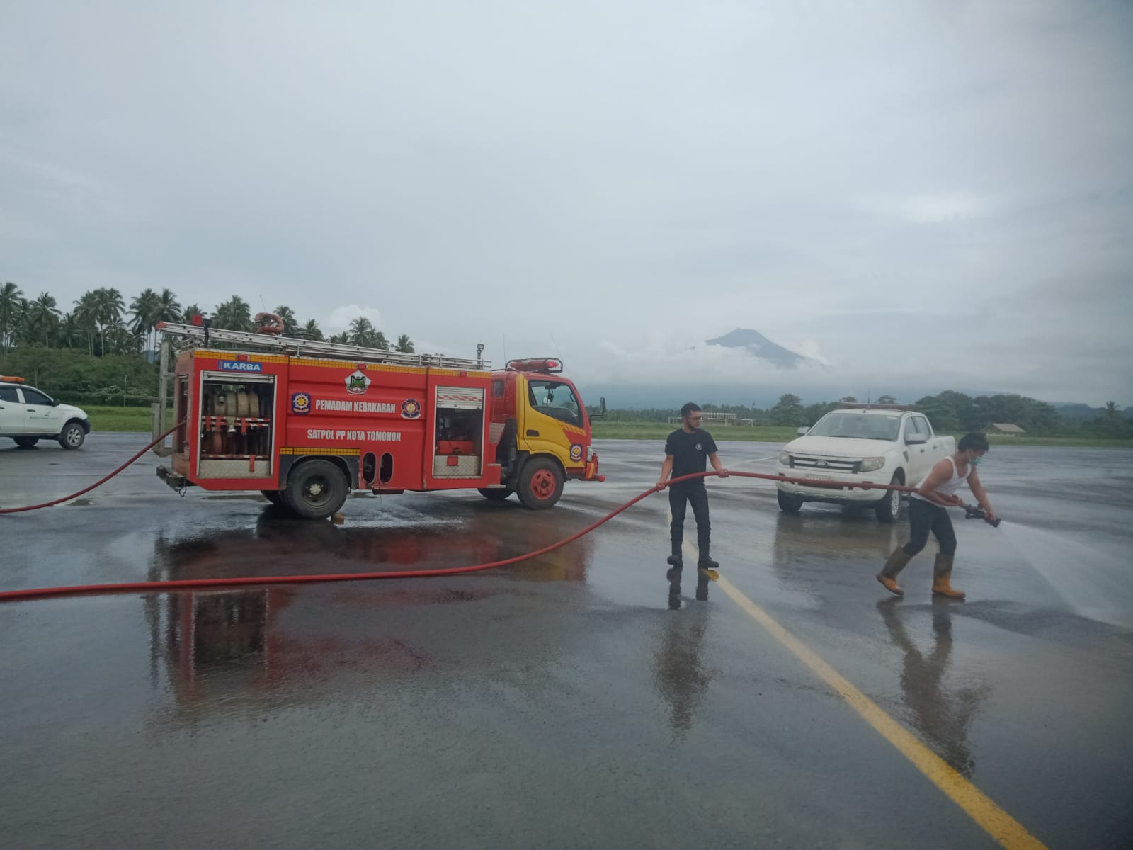 Penyiraman landasan pacu dilakukan tim Damkar Tomohon, dimulai Rabu pagi.